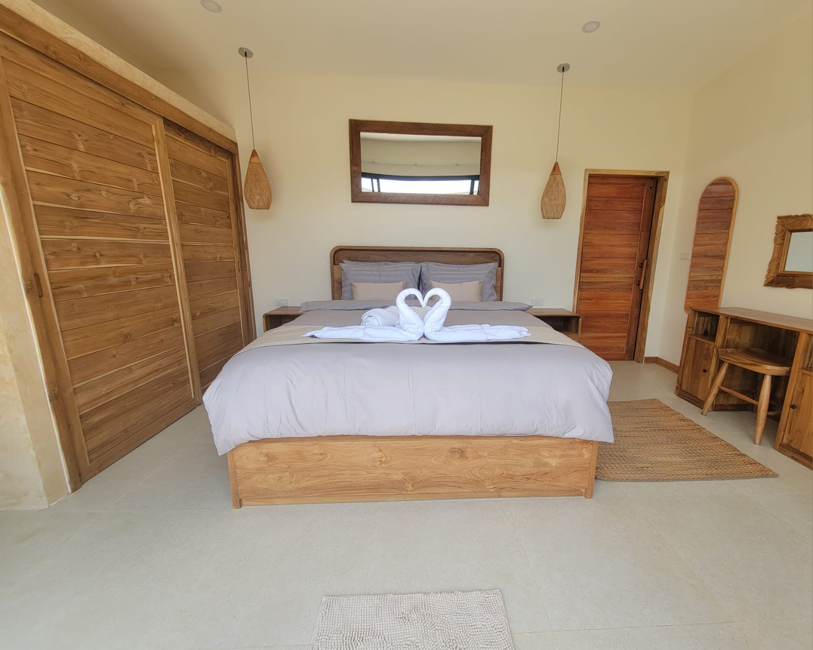 Chambre 3 : Un grand lit double, climatisation, ventilateur et salle de bain avec accès direct à la piscine.