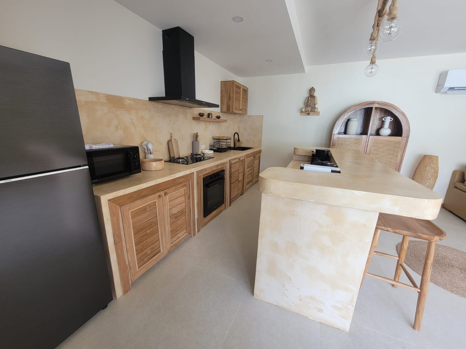 Une cuisine ouverte entièrement équipée (four, machine à café Nespresso, grand frigo) idéale pour préparer vos repas.