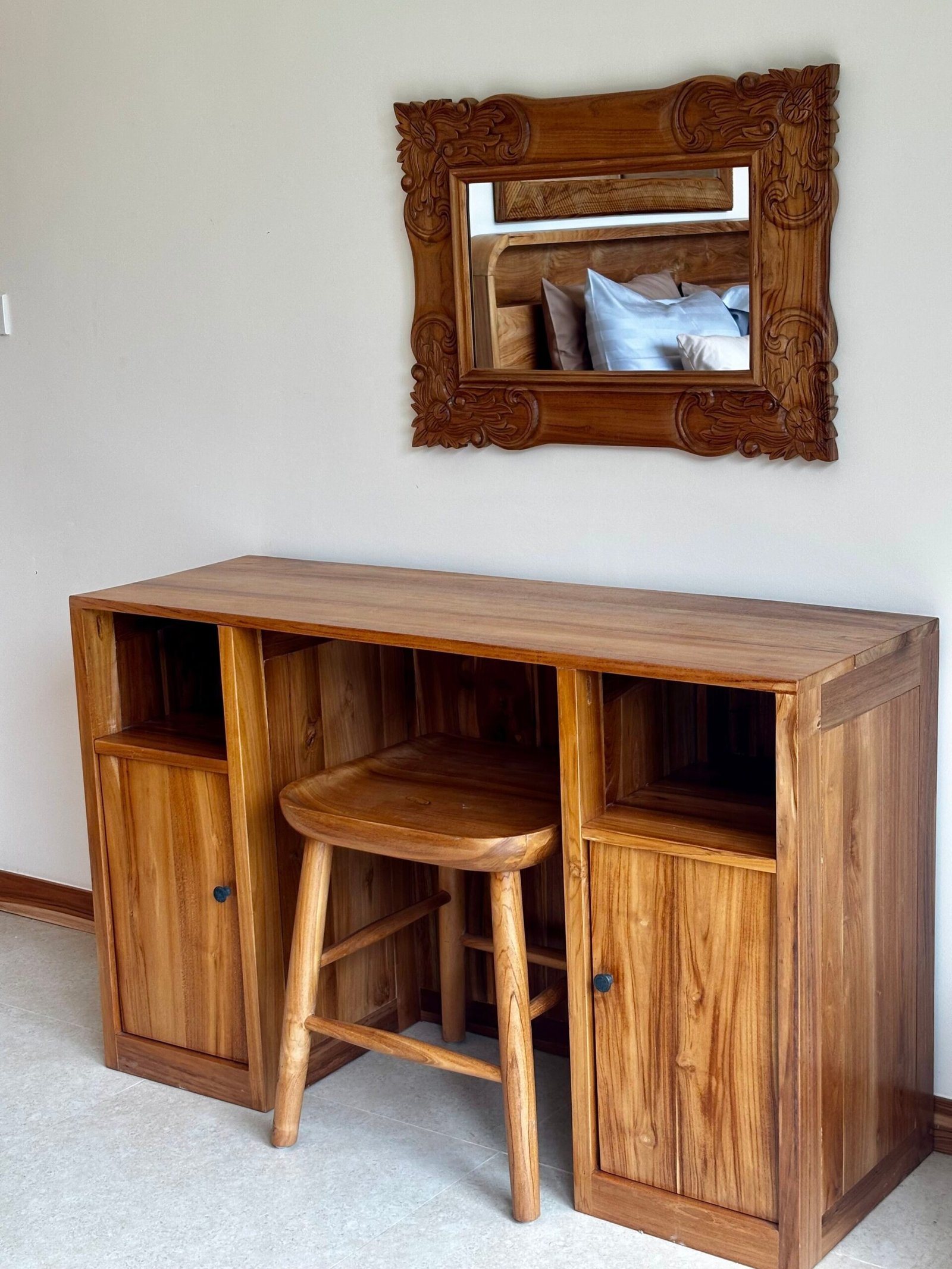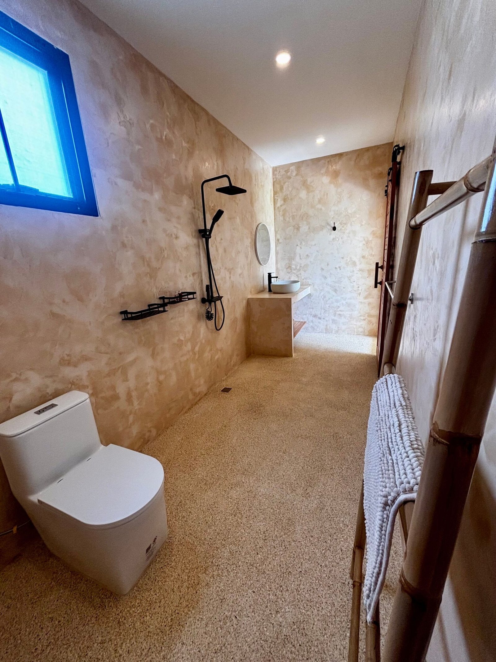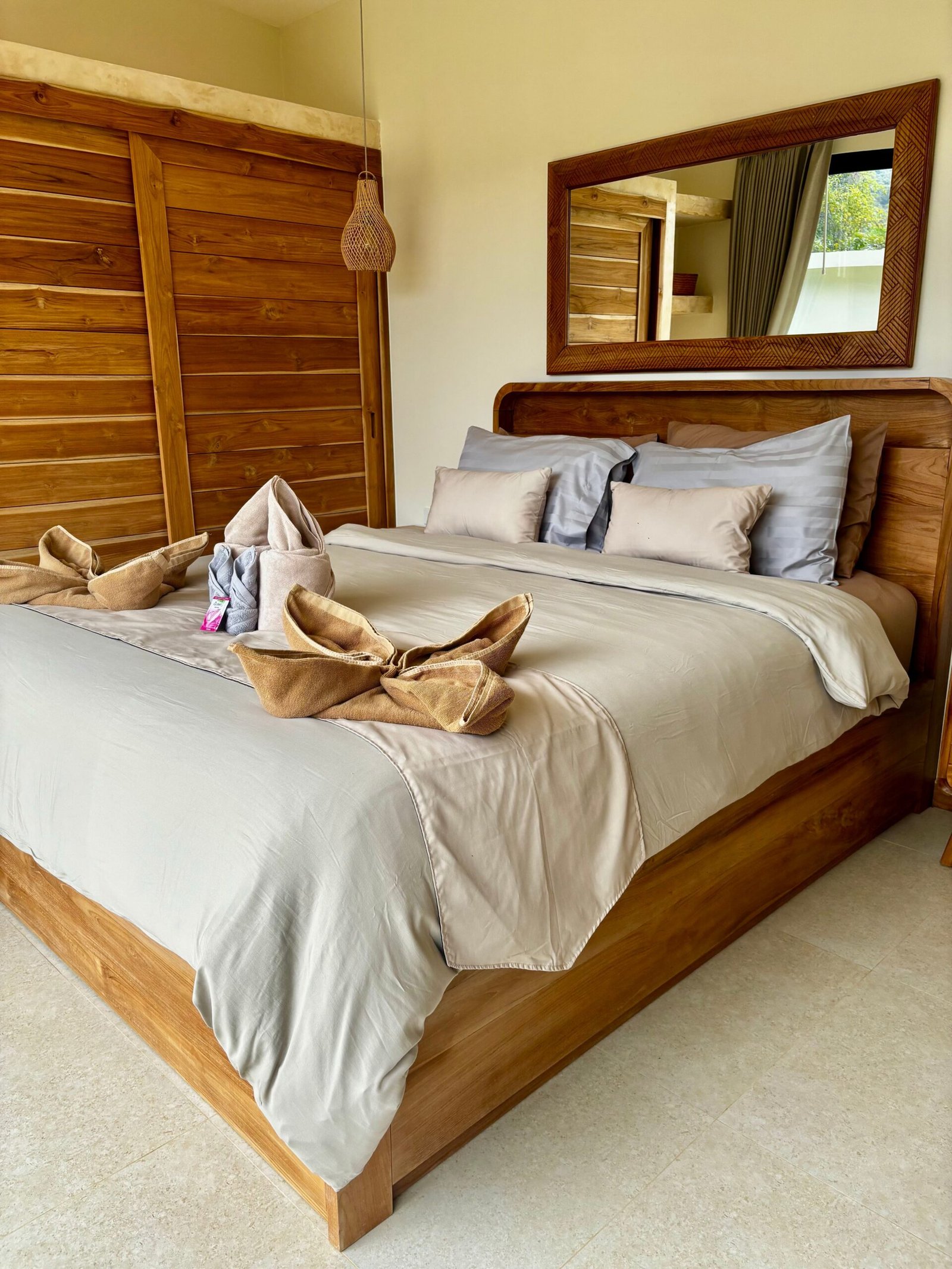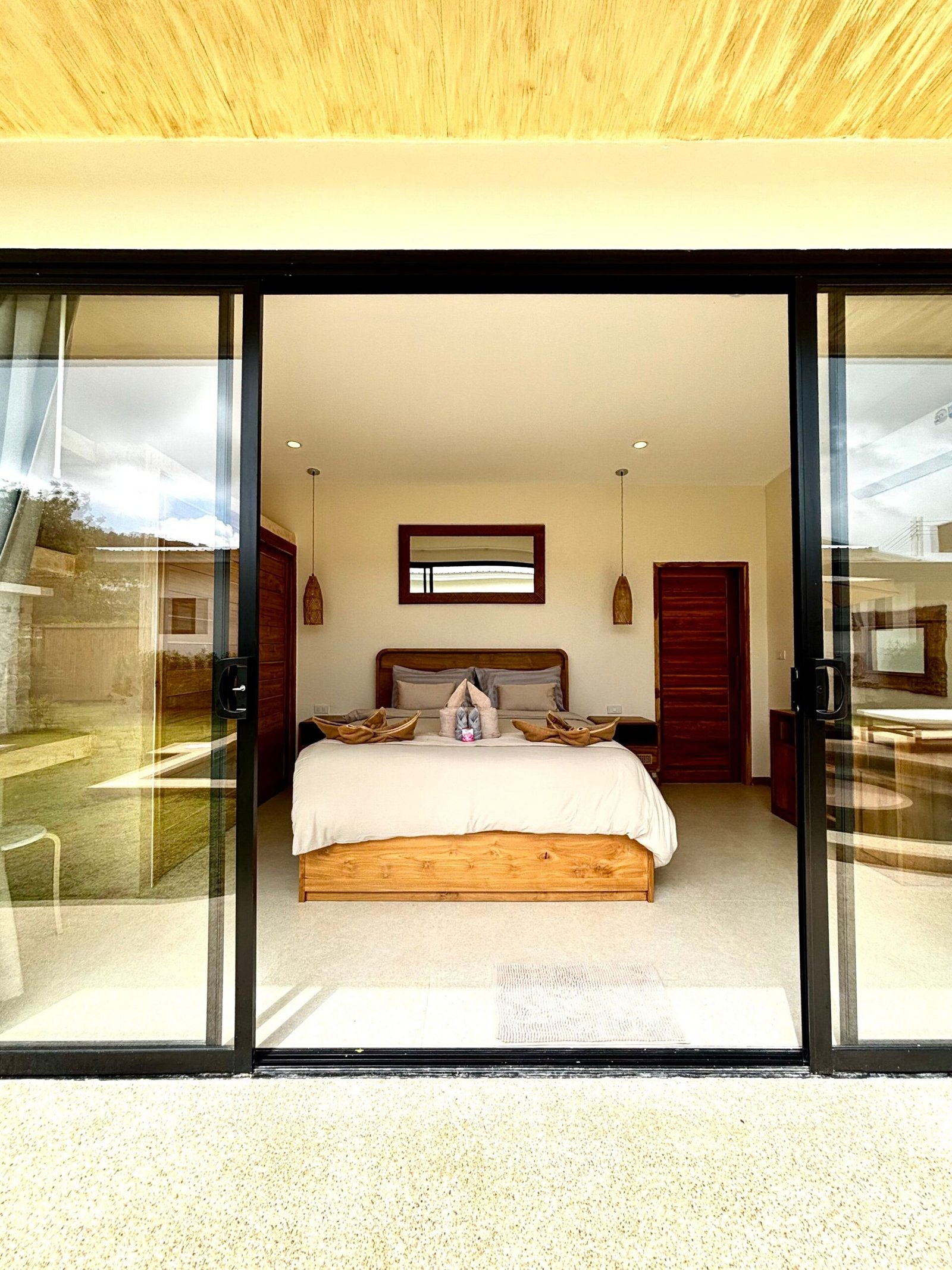 Chambre 3 : Un grand lit double, climatisation, ventilateur et salle de bain avec accès direct à la piscine.