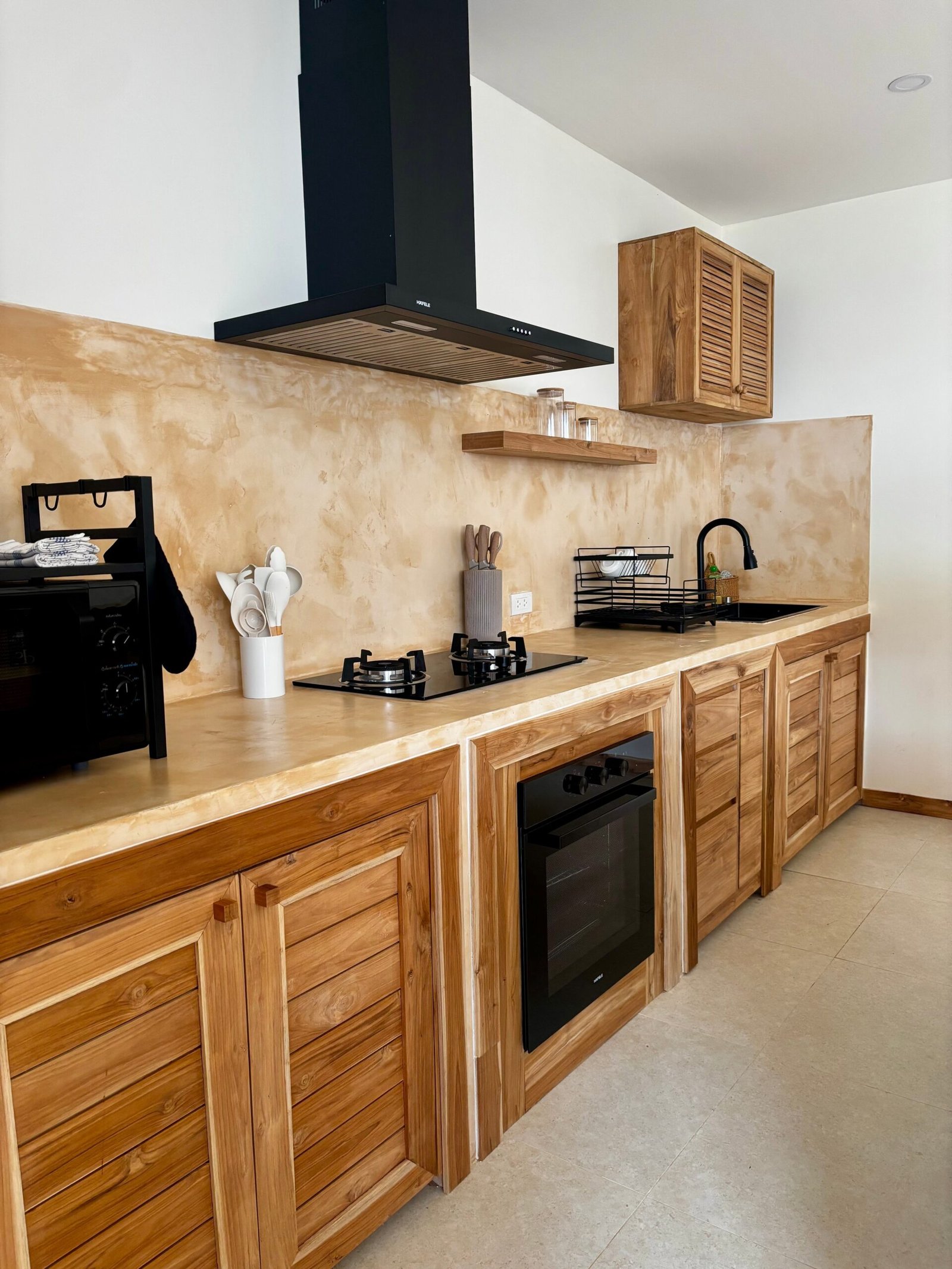 Une cuisine ouverte entièrement équipée (four, machine à café Nespresso, grand frigo) idéale pour préparer vos repas.